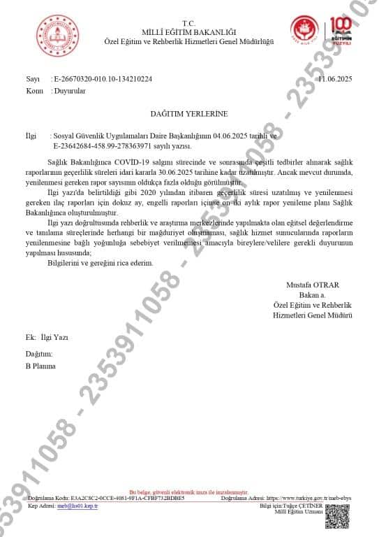 Sosyal Güvenlik Uygulamaları Daire Başkanlığının 04.06.2025 tarihli ve E-23642684-458.99-278363971 sayılı yazısı. Sağlık Bakanlığınca COVİD-19 salgını sürecinde ve sonrasında çeşitli tedbirler alınarak sağlık raporlarının geçerlilik süreleri idari kararla 30.06.2025 tarihine kadar uzatılmıştır. Ancak mevcut durumda, yenilenmesi gereken rapor sayısının oldukça fazla olduğu görülmüştür. İlgi yazı'da belirtildiği gibi 2020 yılından itibaren geçerlilik süresi uzatılmış ve yenilenmesi gereken ilaç raporları için dokuz ay, engelli raporları içinse on iki aylık rapor yenileme planı Sağlık Bakanlığınca oluşturulmuştur. İlgi yazı doğrultusunda rehberlik ve araştırma merkezlerinde yapılmakta olan eğitsel değerlendirme ve tanılama süreçlerinde herhangi bir mağduriyet oluşmaması, sağlık hizmet sunucularında raporların yenilenmesine bağlı yoğunluğa sebebiyet verilmemesi amacıyla bireylere/velilere gerekli duyurunun yapılması hususunda; Bilgilerini ve gereğini rica ederim.